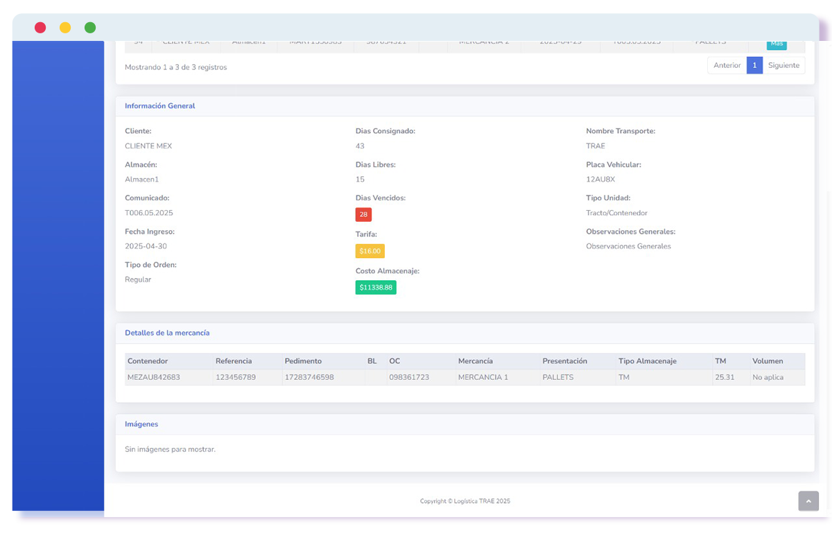 Nuestro sistema permite a los clientes de Logística TRAE acceder en tiempo real a información detallada sobre su inventario en almacén, incluyendo tonelaje, días libres y vencidos, y costos generados por almacenaje. Además, podrán consultar el historial de salidas y exportar su inventario en Excel al instante.